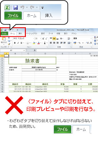 例えば、x下の例のようにEcelで作成した書類を印刷する際に「クイックツールバー」に印刷ボタンを設置しておけば、わざわざタブを切り替えてプレビューや印刷を行わなくてもよいので、非常に便利です。【ない時】![]() |