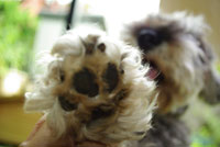我が家の愛犬ミニチュア・シュナウツァーのエリちゃん。意外にも肉球は黒。プニプニしてみたいと思いませんか?エリちゃんと目線を合わせて寝転んで写しました。