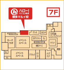 福岡県博多区、KITTE博多・博多マルイの7Fにあるハロー!パソコン教室です。専門店数180以上の魅力あふれる商業施設で、JR博多駅から徒歩1分の立地のためとても通いやすく、お仕事帰りや休日を利用しての通学が大変便利です!